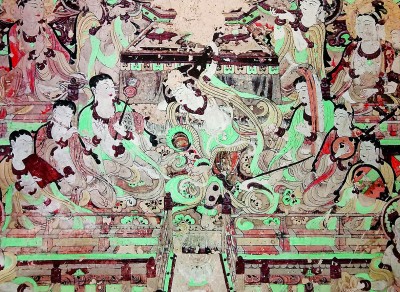 走進(jìn)復(fù)制的莫高窟第220窟,一定要仔細(xì)看看北壁的樂舞圖。它繪制于初唐,是唐代壁畫中最具代表性的,描繪了佛國世界伎樂天奏樂歌舞的場(chǎng)景。畫面正中有一座燈樓,兩側(cè)各立一樹燈輪;左右兩廂置樂隊(duì),共28人,分為兩組,演奏來自中原和西域的各種打擊、吹奏、彈撥樂器;兩對(duì)舞伎在小圓毯上旋轉(zhuǎn)騰踏,巾帛飛揚(yáng),跳著唐代盛行的胡旋舞。