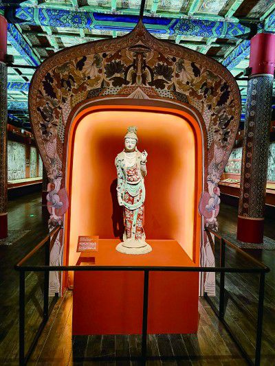 展覽設(shè)在午門—雁翅樓展廳,共展出來自絲綢之路甘肅段的文物及故宮博物院院藏文物188件。展覽還使用敦煌壁畫臨本35件、復(fù)制彩塑6身、高保真數(shù)字化壁畫復(fù)制品70余幅,以及仿制華蓋、佛塔等輔助展品20余件。同時(shí),午門西馬道下還搭建了一個(gè)臨時(shí)展廳,復(fù)原了莫高窟的第285窟、220窟和320窟。走進(jìn)展覽,觀眾能夠近距離體驗(yàn)中華文明千年華彩匯聚的兩大代表——敦煌與紫禁城的獨(dú)特魅力。