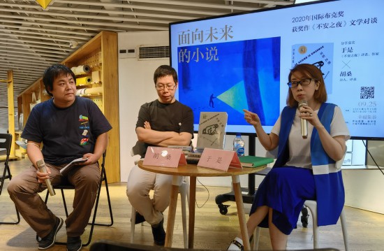 9月25日,《不安之夜》譯者、作家于是(右),詩(shī)人、譯者胡桑(中)做客上海幸福集薈,就《不安之夜》展開(kāi)一場(chǎng)名為“面向未來(lái)的小說(shuō)”的對(duì)談。左為該書(shū)責(zé)編曹晴。澎湃新聞?dòng)浾?羅昕 圖