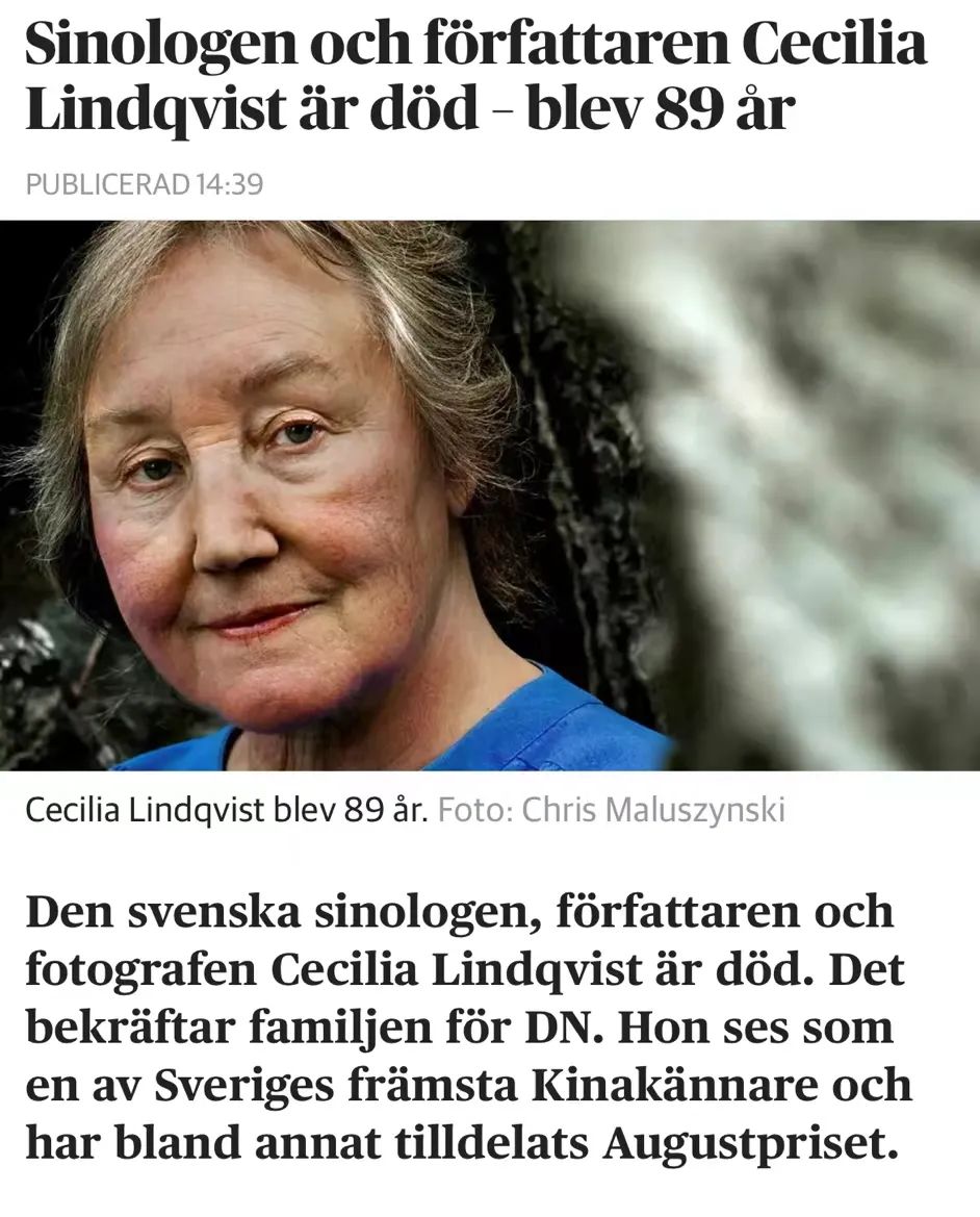 澎湃新聞從活字文化方面獲悉,瑞典漢學家林西莉(Cecilia Lindqvist)于當?shù)貢r間上周日(9月26日)去世,享年89歲。1950年代末,林西莉跟隨瑞典漢學家高本漢(Klas Bernhard Johannes Karlgren)學習漢語。1961年至1962年,林西莉來到北大讀書求學,此后曾數(shù)十次到中國訪問。
