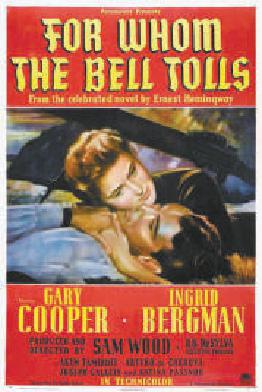 1943年,《喪鐘為誰而鳴》被搬上銀幕,影片由美國(guó)派拉蒙影業(yè)公司出品,加里·庫珀、英格麗·褒曼等聯(lián)合主演,影片獲得第16屆奧斯卡金像獎(jiǎng)9項(xiàng)提名(最佳影片、最佳男主角、最佳女主角、最佳男配角、最佳女配角、最佳攝影、最佳電影剪輯、最佳藝術(shù)指導(dǎo)、最佳配樂)。影片被引進(jìn)到中國(guó),中文譯名《戰(zhàn)地鐘聲》。
