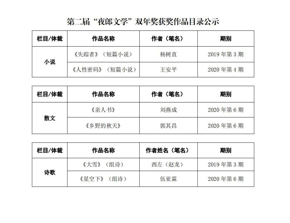 黔南州文聯(lián)《夜郎文學(xué)》評(píng)選的“夜郎文學(xué)獎(jiǎng)”,致力于培養(yǎng)和壯大作家隊(duì)伍,形成“創(chuàng)作、展示、交流、提升”良好氛圍,鼓勵(lì)作家創(chuàng)作更多謳歌真善美、傳遞正能量的優(yōu)秀文學(xué)作品。