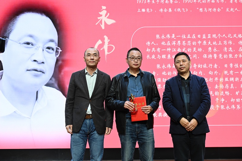 詩人、《詩潮》主編劉川,浙江省作協(xié)副主席、《江南》雜志副主編、小說家哲貴為張永偉頒獎