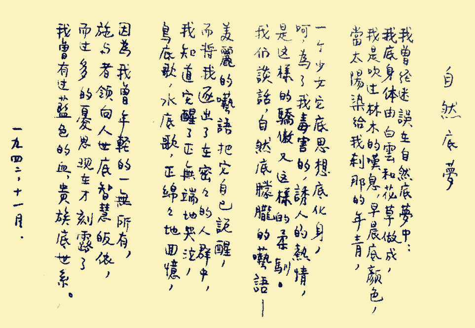 出于身體的原因,1942年底,穆旦因病自印度返回昆明,離開了軍隊。這段時期,友人唐振湘曾有一段回憶道及穆旦的一件可能從印度帶回的外套:“當時我們的生活很艱苦,穿的衣服多數(shù)是來昆明以前置備的,少而舊。不知何時何人在房內(nèi)遺下一件全新的毛料外套,經(jīng)過相當長的時日,無人認領(lǐng)。我認為可能是穆旦從印度帶回的,幾次問他,他都搖頭,卻說:‘管它是誰的,誰需要就穿吧。’于是我們肯定那是他送給我們而又不愿明說?!蹦碌┑纳畈灰姷脙?yōu)裕,全新的毛料外套價格不菲,但面對比自己更艱苦的朋友們,詩人極有同情心而又非常顧及朋友們的尊嚴。
