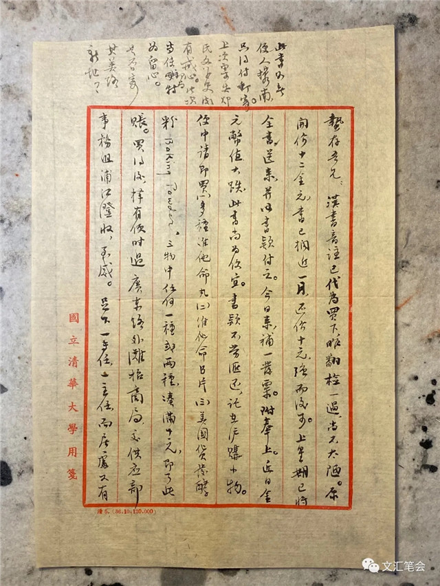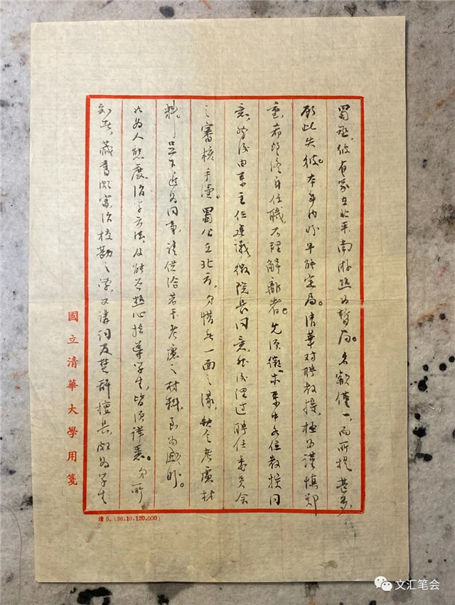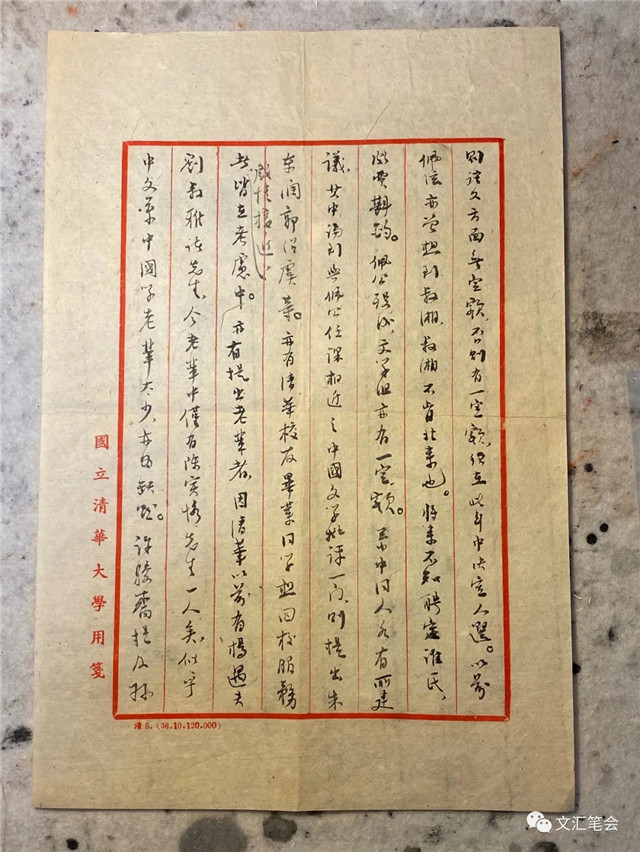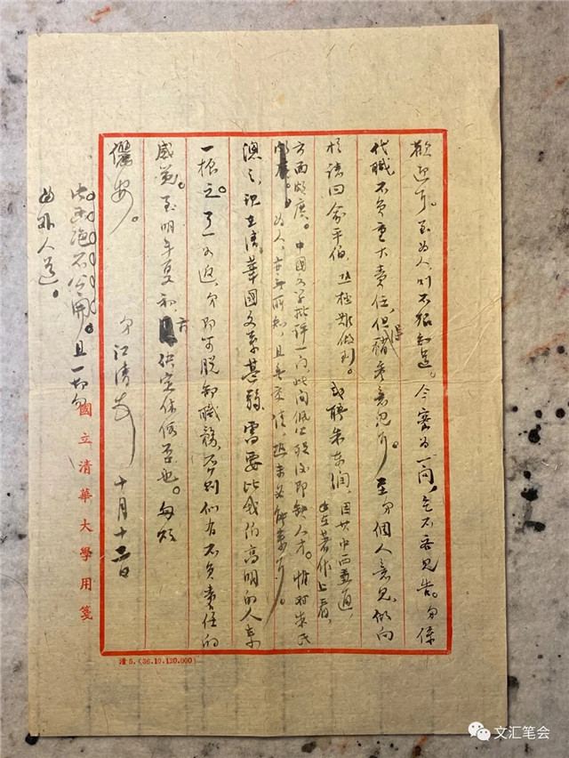 浦先生與施蟄存先生是同鄉(xiāng)兼同學,施先生在《浦江清文史雜文集》序言中寫到:“從小學到中學這十年間,我們每天同坐在一個教室里聽老師講課。每星期日,除非雨雪,不是我到他家,就是他來我家,一起抵掌高談,上下古今。中學畢業(yè)后,他就讀于南京東南大學,我在杭州之江大學。從此我們就少了見面的機會,但是我們每星期都有書信往來。”其實他們的書信往來一直持續(xù)到浦先生的晚年。施老2003年11月去世,所藏碑帖及書信等流出,市上所見浦先生給施老的信中有用毛題清華大學、北京大學抬頭信箋所書者,可知。
