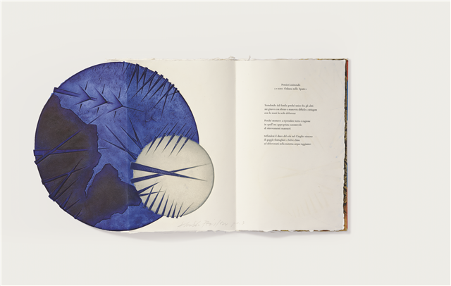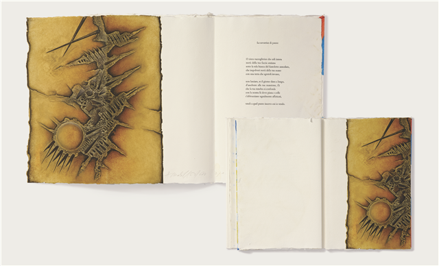 至于第三種類型,我愿意稱之為“樂(lè)隊(duì)類型”的藝術(shù)家手作書(shū)。這類創(chuàng)作通常由等量級(jí)的藝術(shù)家圍繞一個(gè)共同的主題聯(lián)合創(chuàng)作,比較強(qiáng)調(diào)參與者在藝術(shù)史地位、社會(huì)地位等層面上的對(duì)等。比如我收藏的一套由20世紀(jì)公認(rèn)的意大利最著名的八位雕塑家聯(lián)合創(chuàng)作的作品《友誼之光》,是為了慶祝意大利國(guó)寶級(jí)藝術(shù)家阿納爾多?波莫多羅90歲生辰所作。
