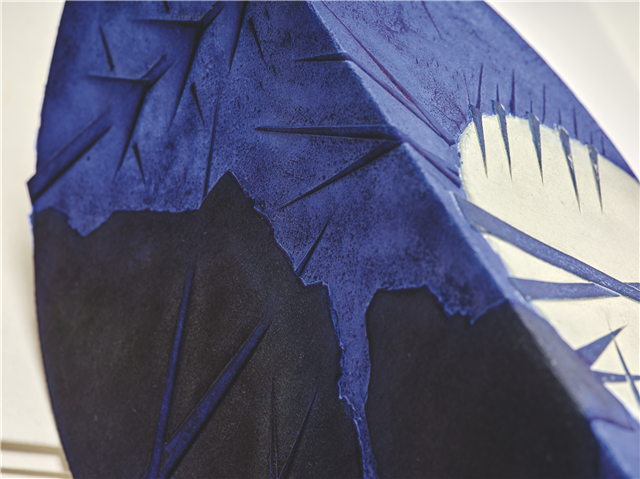 形容《玫瑰與天空之喜悅》令人嘆為觀止毫不夸張。書(shū)中奇異華美的“紙上雕塑”呈現(xiàn)出一種匪夷所思的金石質(zhì)感。如果有機(jī)會(huì)漫步意大利梵蒂岡,就應(yīng)該對(duì)梵蒂岡博物館庭院中庭的一件黃銅質(zhì)地雕塑過(guò)目難忘。這件被命名為《球中球》的球形雕塑直徑超過(guò)4米,觀者透過(guò)球體的裂縫可以看到犬牙交錯(cuò)的“利齒”,既像交錯(cuò)的齒輪,又讓人聯(lián)想到累累的傷痕。這樣一座富有現(xiàn)代感的作品佇立于古老的梵蒂岡中庭非但毫不違和,反而氣場(chǎng)強(qiáng)大,恰如其分地烘托和呼應(yīng)了這里宗教與藝術(shù)圣地的氛圍。藝術(shù)家手作書(shū)《玫瑰與天空之喜悅》中鋸齒的形狀和金石般的肌理與這一雕塑的特點(diǎn)如出一轍。它們到底是如何產(chǎn)生的呢?原來(lái),意大利地中海中部沿岸,居住著一些從事雕塑及首飾創(chuàng)作的家庭,因地制宜地利用墨魚(yú)體內(nèi)一種圓弧狀的骨頭制作母版,是這些手工家族中世代流傳的鑄造秘密。雕塑上那些既具有點(diǎn)狀肌理,又具有金石質(zhì)感的樣子,便來(lái)自那些致密而堅(jiān)硬,“即使在火中也無(wú)法輕易燒化”的骨骼。