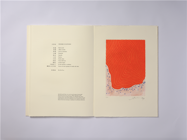 比如《書(shū)之極》中收錄的蕭勤作品《夜光杯》制作年代在2001年,對(duì)應(yīng)的恰恰是藝術(shù)家創(chuàng)作階段中的“美麗新世界”時(shí)期。在66歲這個(gè)年紀(jì),無(wú)論是藝術(shù)造詣還是創(chuàng)作心境,藝術(shù)家都已經(jīng)從年輕時(shí)的躁動(dòng)不安,升華到了一個(gè)恬靜淡泊、寧?kù)o致遠(yuǎn)的境界。在這個(gè)作品當(dāng)中,蕭勤為每一幅版畫(huà)搭配了兩首中國(guó)古詩(shī),從選題中不難看出,詩(shī)畫(huà)在意境表達(dá)上非常一致,體現(xiàn)了空靈、悠遠(yuǎn)的感懷與大氣象。相對(duì)于以完全的虛空或以現(xiàn)實(shí)世界作為背景,蕭勤畫(huà)面最終的背景,是一個(gè)仿佛無(wú)限延伸,能夠容納所有物質(zhì)及能量、表面空虛的“無(wú)邊能量感應(yīng)場(chǎng)”。由此可見(jiàn),經(jīng)由一本藝術(shù)家手作書(shū),透視一位藝術(shù)家一段時(shí)光中的藝術(shù)轍痕,生動(dòng)可感,饒有趣味。