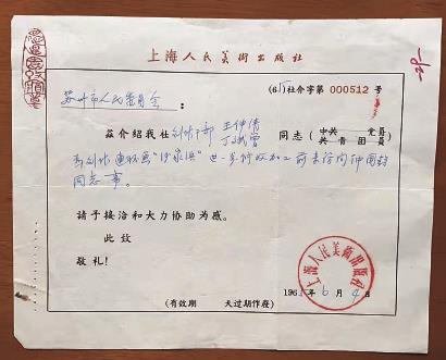 事實上,作為一個同樣生活在常熟、蘇州這片土地上的一名當(dāng)代作家,我在很小的時候就早已知道了“仲國鑒”、“任天石”、“葉飛”、“譚震林”和“江抗”、“民抗”這些英雄的名字與抗日進步組織。只是沒有想到的是:其中的仲國鑒老英雄竟然還是一名創(chuàng)作成果豐碩的作家,這一點尤其令我感動和欽佩。上世紀五六十年代他在《上海文學(xué)》《萌芽》《雨花》等雜志上發(fā)表作品時,我還是個剛出生的小囡囡。由此也特別覺得他的大兒子仲力為先生給我展現(xiàn)他父親留下的那些算起來都在半個多世紀前的珍貴史料時也異常感到珍貴。比如有一張上海人民美術(shù)出版社在1965年6月4日開出一份“介紹信”,令我十分好奇,介紹信這樣說:
