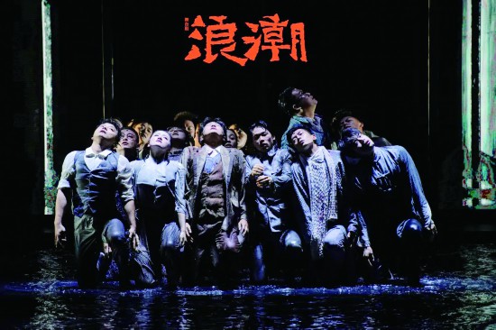 作品的張力還離不開舞臺的形式表達。導演對時空假定性的運用,借助電影中慣用的閃回、插敘、倒敘等語言顛覆了戲劇舞臺上線性的時間觀念,通過對時間的打碎、停頓、快倒等手段制造“陌生化”效果。還有對“浪潮”這一意象的空間營造,既通過對水元素的激情應用,也借助了現(xiàn)代舞語匯的肢體表達,這種舞臺手段的綜合,各種藝術元素的疊加,最終成就了一部超越革命主題、具有現(xiàn)代性審美價值的戲劇作品。