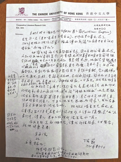 90年代,開(kāi)始有了復(fù)印,父親如獲至寶,常光顧附近復(fù)印店。冥冥中感到時(shí)日不多的他,開(kāi)始有意將自己要寄出的信先復(fù)印再寄出,因而給我留下了相當(dāng)數(shù)量的書(shū)信筆跡。其中致聯(lián)大師生的比重很大,有馮至、許淵沖、鄭敏、杜運(yùn)夑、巫寧坤、江瑞熙等??上臎](méi)見(jiàn)過(guò)他寫(xiě)給南湖詩(shī)社同仁周定一的信,時(shí)隔31年,今天這封信我居然能見(jiàn)到,實(shí)在幸哉!寫(xiě)到這,我還要感謝馮至女兒馮姚平曾將我爸寫(xiě)給她父親的信復(fù)印件寄給我,她比我更早整理父輩的工作,給了我很大啟發(fā)。