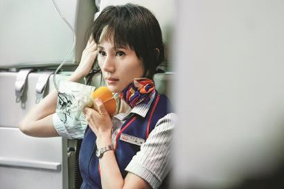 看過(guò)袁泉《中國(guó)機(jī)長(zhǎng)》中的表演,就能理解文婷醫(yī)生的成功塑造并非偶然。乘務(wù)長(zhǎng)畢男形象的確立不僅僅依靠前文提到的她蘊(yùn)含豐富情緒的雙眼,更是她對(duì)角色整體的塑造。畢男在面對(duì)乘客時(shí)立即呈現(xiàn)空乘人員的職業(yè)姿態(tài),回到操作間與同事吐槽時(shí)放松的姿態(tài),以及機(jī)艙內(nèi)突發(fā)釋壓的情況下,她衣著和妝發(fā)因巨大氣流沖擊而凌亂,但表情和身體迅速恢復(fù)職業(yè)姿態(tài)冷靜安撫乘客。一次一次為核實(shí)同事安全和安撫乘客,畢男冒著生命危險(xiǎn)摘下氧氣面罩,盡量克制自己的恐懼,極力保持專業(yè)的狀態(tài)。袁泉的表情、微表情、身體的姿態(tài)都傳達(dá)出角色極度緊張,有細(xì)微的躊躇但又迅速冷靜的內(nèi)心變化。這一系列情境轉(zhuǎn)變中角色的表演完全隨著影片敘事而行進(jìn),看似行云流水,卻是演員常年自律和勤奮的體現(xiàn)。
