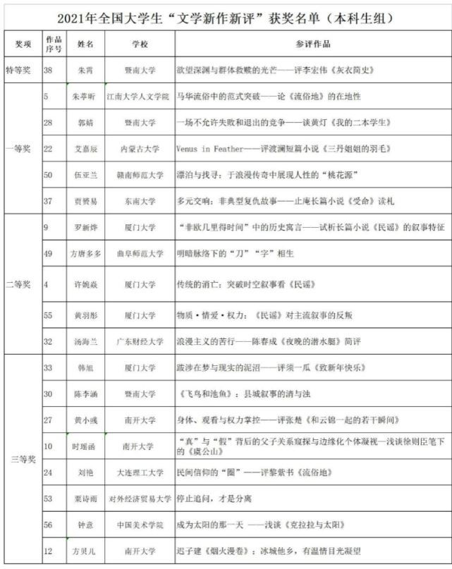 參賽的評論作品涉及2020年至2021年發(fā)表出版的文學(xué)新作,既有對莫言《晚熟的人》、余華《文城》、黎紫書《流俗地》等名家新作的評論,也關(guān)注到陳春成、班宇、路內(nèi)、王占黑等青年作家的新作,展示了新一代大學(xué)生多元開放的審美趣味和嶄新的表達風(fēng)格。