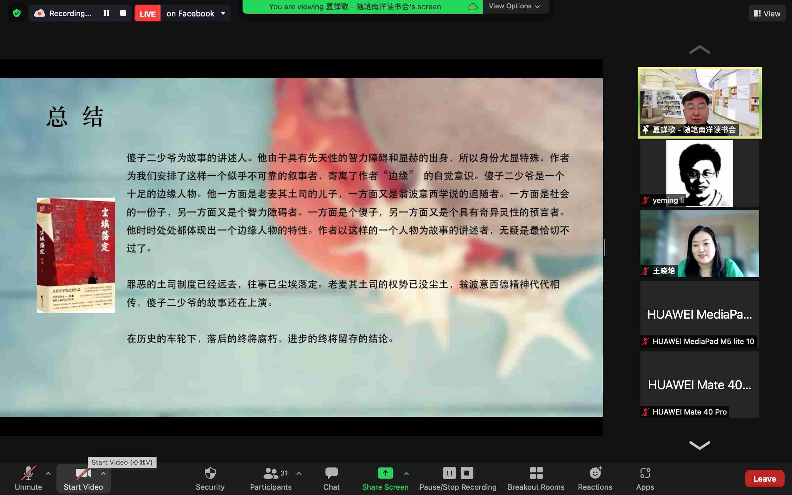 當(dāng)天導(dǎo)讀活動(dòng)有40多人通過Zoom線上出席,多位新加坡作家出席了讀書會(huì),同時(shí)也在擁有一萬多名粉絲的新加坡圖書館的臉書頁面上做了直播,視頻可供讀者長(zhǎng)期回看。在討論階段,大家還就小說中的女性話題、魔幻現(xiàn)實(shí)主義和藏族特有的文化和宗教傳統(tǒng)等問題進(jìn)行深入討論,讓大家對(duì)神秘、浪漫的藏族文化和歷史久遠(yuǎn)的土司制度的來龍去脈有了更深入的了解。分享會(huì)最后,不少讀者現(xiàn)場(chǎng)表示,希望將來有機(jī)會(huì)能親眼去康巴地區(qū)看一看,進(jìn)一步感受藏族文化的歷史和現(xiàn)在、感受中國(guó)社會(huì)的發(fā)展和變化。