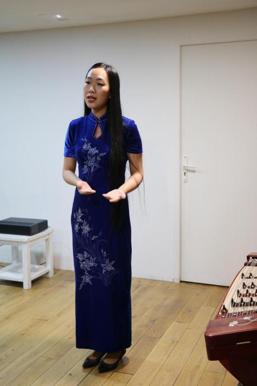 最后,揚(yáng)琴演奏家王女士演奏了中國(guó)傳統(tǒng)古曲,取材于昭君出塞故事的“妝臺(tái)秋思”和江蘇民歌“紫竹調(diào)”。