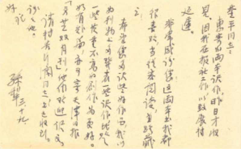 在《張中老,走好》一文的最后,林楚平說自己“在交友方面是十分差勁的”,一是認(rèn)路的本領(lǐng)太糟糕,其次“像汪曾祺、張老、孫犁這些作家原是有可能交往或保持通訊聯(lián)系的,但總覺得他們是文債纏身的大作家,給他們寫信就是打攪,也就怯于執(zhí)筆,聯(lián)系也就不能持久”。這方面的心理倒與我很相像。有意思的是,我同時(shí)還收藏了一枚孫犁先生1983年寫給林楚平的明信片,這也從另一個(gè)方面印證了林楚平上面的話。20世紀(jì)80年代后,孫犁先生給朋友寫信,基本都是用的郵資明信片。查閱山東畫報(bào)出版社1998年出版的孫犁著《蕓齋書簡》,大象出版社2004年出版的《蕓齋書簡續(xù)編》,以及人民文學(xué)出版社2004年版《孫犁全集》,都未收錄這通書簡,在此抄錄,以備后人加以輯佚研究: