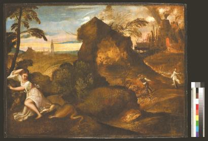 提香出奇的長壽,他活了88歲,活著的時(shí)候就獲得了潑天富貴,留下的作品很多,名聲也很大。此次展覽里,有一件提香的作品《俄耳甫斯與歐律狄刻》,幅面不大,可能讓一些沖著提香如雷貫耳大名頭來的觀眾,略略感到失望。不過我想在風(fēng)景畫的發(fā)展脈絡(luò)上,來說說這張畫。