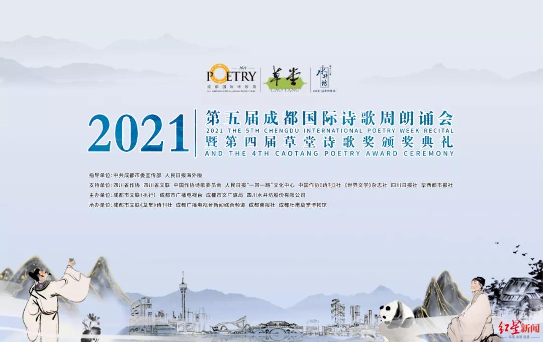 18日下午,在中共成都市委宣傳部、《人民日報》海外版的指導下,四川省作家協(xié)會、四川省文學藝術界聯(lián)合會、中國作協(xié)詩歌委員會、《人民日報》“一帶一路”文化中心、中國作協(xié)《詩刊》社、《世界文學》雜志社等支持下,由成都市文聯(lián)、成都市廣播電視臺、成都市文廣旅局、四川水井坊股份有限公司主辦,由成都市文聯(lián)《草堂》詩刊社、成都市廣播電視臺新聞綜合頻道(成都電視發(fā)展有限公司)、成都商報社、杜甫草堂博物館承辦的2021·第五屆成都國際詩歌周朗誦會暨第四屆草堂詩歌獎頒獎典禮,在成都杜甫草堂隆重舉行。