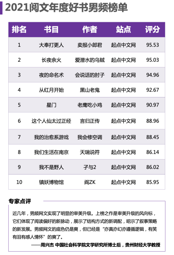 “近幾年,男頻網(wǎng)文實(shí)現(xiàn)了明顯的審美升級?!?中國社會(huì)科學(xué)院文學(xué)研究所博士后、貴州財(cái)經(jīng)大學(xué)教授周興杰評價(jià),《2021閱文年度好書榜》的男頻榜單,客觀反映了好書品質(zhì),網(wǎng)文的腦洞要大,邏輯要通,才能受人追捧。盡管男頻網(wǎng)文底色未變,但實(shí)現(xiàn)“爽”的方式以及“爽”的耐受有了明顯拔高,已經(jīng)是“亦真亦幻亦遵循邏輯,有笑有淚有感人情懷”的爽了。