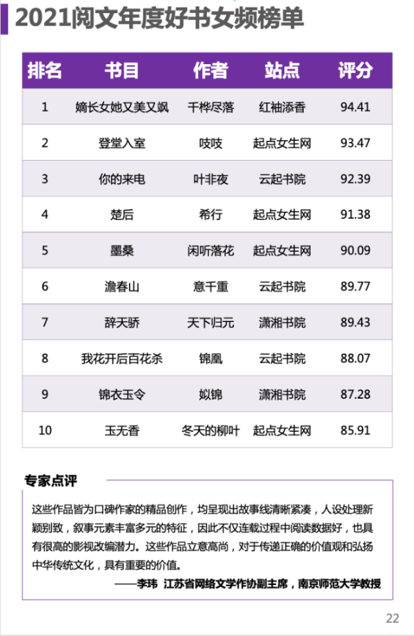 “上榜女頻作品均呈現(xiàn)出故事線清晰緊湊,人設(shè)處理新穎別致,敘事元素豐富多元的特征,因此不僅連載過程中閱讀數(shù)據(jù)好,也具有很高的影視改編潛力。這些作品立意高尚,對于傳遞正確的價(jià)值觀和弘揚(yáng)中華傳統(tǒng)文化,具有重要的價(jià)值?!?江蘇省網(wǎng)絡(luò)文學(xué)作協(xié)副主席、南京師范大學(xué)教授李瑋評價(jià)。