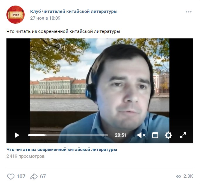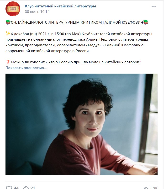 因疫情原因,上述兩場(chǎng)活動(dòng)均在線上舉行,并通過(guò)俄羅斯社交平臺(tái)VK進(jìn)行分享。每場(chǎng)活動(dòng)均有六十多位觀眾線上參加,活動(dòng)視頻觀看人數(shù)達(dá)四千多人次。俄羅斯“中國(guó)文學(xué)讀者俱樂(lè)部”將繼續(xù)發(fā)揮橋梁作用,加強(qiáng)與讀者的溝通對(duì)話,不斷向俄羅斯讀者介紹優(yōu)秀的中國(guó)文學(xué)作品,向俄羅斯人民講述當(dāng)代中國(guó)的精彩故事。