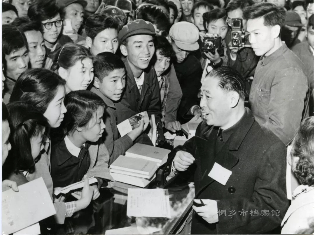 1957年11月7日,新華書店為紀(jì)念和慶祝十月革命四十周年,在勞動人民文化宮舉辦露天書市,茅盾應(yīng)邀參加并為讀者簽名留念。(桐鄉(xiāng)市檔案館藏)