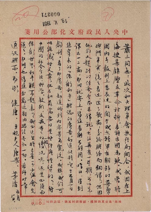 展品中含有20余通未被《茅盾全集》《茅盾全集·補遺》或《茅盾書信集》等收錄的信札,包括茅盾致蕭三書簡11通,致陳白塵、沙博理、普實克、柯靈等人共十余通;另有桐鄉(xiāng)市檔案館傾情提供的茅盾珍貴手稿及照片,首次在北京公開展示。這些極其珍貴的手稿,對促進茅盾生平、思想及其作品的研究,對促進我國建黨初期革命文藝的研究,都具有十分重要的意義。