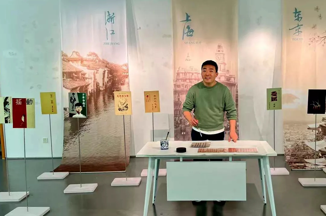 立體書裝置自成打卡留念區(qū),看完手跡展,站在茅公書桌前,自己也揮筆在字帖上留下墨跡。