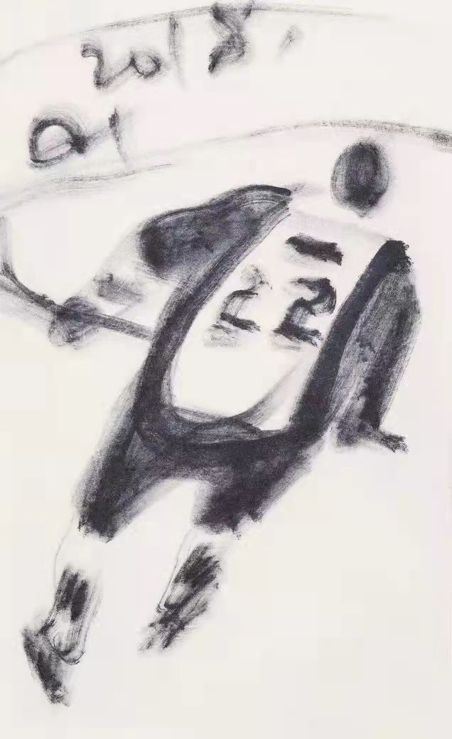 2000年以來(lái),楊剛對(duì)著電視中的比賽場(chǎng)景創(chuàng)作了大量冬奧題材作品,用毛筆、馬克筆,或簽字筆、圓珠筆在各類(lèi)紙上,畫(huà)下了千姿百態(tài)的速寫(xiě)和水墨畫(huà)。他喜歡速寫(xiě)的現(xiàn)場(chǎng)感,也強(qiáng)調(diào)線的趣味性,畫(huà)速寫(xiě)成為他藝術(shù)人生的一大樂(lè)事。這些冬奧作品將速寫(xiě)與書(shū)法用筆、意象造型相結(jié)合,融入現(xiàn)代抽象與構(gòu)成元素,藝術(shù)形象鮮活生動(dòng),所繪對(duì)象既有轉(zhuǎn)瞬即逝的臨場(chǎng)感與沖擊力,又有雕塑般的體量感和永恒性,在寥寥數(shù)筆中實(shí)現(xiàn)了“速度”與“力量”的矛盾統(tǒng)一,體現(xiàn)出生命的律動(dòng)和生生不息的奧運(yùn)精神。