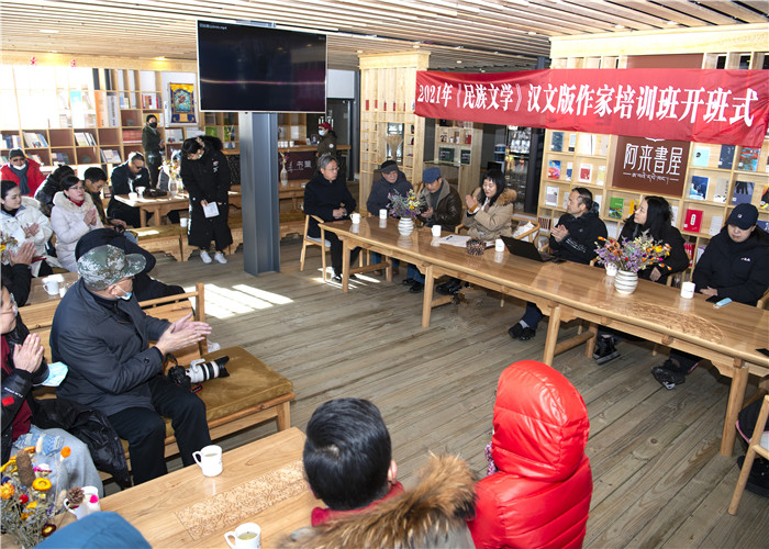 文學(xué)周期間,“2021《民族文學(xué)》漢文版作家培訓(xùn)班”開班儀式在小金縣四姑娘山阿來書屋舉行。石一寧與阿壩州文聯(lián)副主席王慶九先后致辭,陳亞軍主持開班儀式。