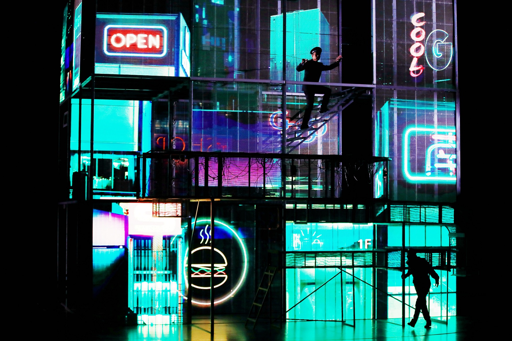 話劇《英雄時代》于2021年4月作為中國國家話劇院首部“高清影像話劇”開機錄制,經(jīng)過半年打磨迎來線下首演,成為“雙演融合”的新嘗試。導(dǎo)演白皓天采用現(xiàn)實時間與舞臺時間同步的藝術(shù)手法,觀眾走進劇場便進入了沉浸式體驗。屏幕上不斷閃現(xiàn)實時變化人數(shù)、倒計時的指針聲都在提醒觀眾,定時炸彈即將引爆。為了配合劇中與高科技相關(guān)的犯罪情節(jié),舞美總監(jiān)劉科棟將整個舞臺打造成了樓體框架結(jié)構(gòu)的九宮格魔方,運用三層轉(zhuǎn)臺變幻出商場、指揮中心、拳擊館、警務(wù)室、街道等場景。視覺總監(jiān)孔慶堯則用燈光、色調(diào)營造出充滿科技感、現(xiàn)代感的舞臺氛圍,以五彩斑斕的霓虹燈、LED廣告牌等燈光線條營造出了如科幻電影里未來城市般的質(zhì)感。在導(dǎo)演白皓天看來,“謳歌英雄、謳歌人民是我們創(chuàng)作的初衷,此次能夠和劇院諸多藝術(shù)家合作,體現(xiàn)了劇院‘傳幫帶’的傳統(tǒng),共同講述有溫度的新時代公安形象,期待更多年輕觀眾走進劇場,發(fā)現(xiàn)主旋律也能很好看。”