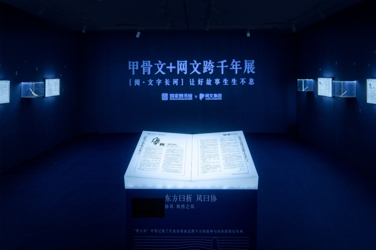 正在國圖?津?yàn)澄膭?chuàng)空間展出的“甲骨文+網(wǎng)文跨千年展”中,不同時(shí)代的文字匯聚交融,形成了別出心裁的“閱?文字長河”藝術(shù)裝置,甲骨文、金文、小篆、隸書、楷書、簡化字,文字流變的脈絡(luò)在其間清晰可見。觀眾觀展時(shí),不僅可以近距離感受甲骨文的字形之美,還可以掃碼閱讀網(wǎng)文作家為它創(chuàng)作的微故事。國家圖書館副館長張軍期待,通過活動(dòng)進(jìn)一步擴(kuò)大古文字文化的傳播,推動(dòng)中華優(yōu)秀傳統(tǒng)文化創(chuàng)造性轉(zhuǎn)化、創(chuàng)新性發(fā)展,展現(xiàn)中華文化的影響力、凝聚力、感召力。