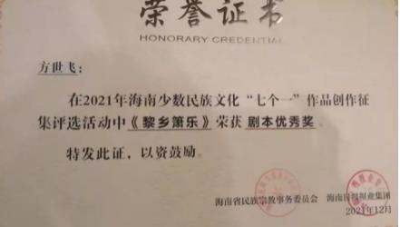1月9日,2021年海南省少數(shù)民族文化“七個一”作品創(chuàng)作征集評選活動在??谂e行頒獎禮,全國少兒科幻聯(lián)盟作家柯漁(本名方世飛)的海南黎族傳統(tǒng)文化題材劇本《黎鄉(xiāng)簫樂》榮獲劇本優(yōu)秀獎。