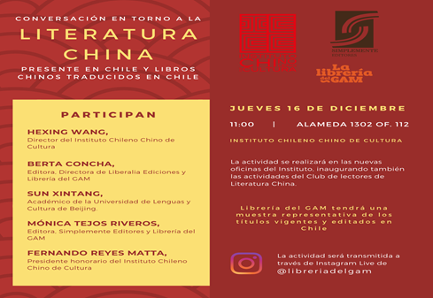 2021年12月16日,智利“中國文學(xué)讀者俱樂部”在位于智利圣地亞哥市中心的“智中文化協(xié)會”新辦公室正式掛牌揭幕,并舉行了首場活動“中國文學(xué)對話會”。智中文協(xié)主席、前智利駐華大使雷耶斯·馬塔教授、辛普雷門特出版社社長莫妮卡·特霍斯、雷特拉里亞出版社社長貝爾塔·貢恰、智中文化藝術(shù)中心主席胡安·卡洛斯·拉米雷斯和雷斯基金會主席卡洛斯·雷耶斯等現(xiàn)場出席了活動,北京語言大學(xué)拉美研究中心主任、阿根廷國會大學(xué)教授孫新堂線上參加?;顒赢?dāng)天進行了直播,有60多位讀者線上參加了活動。