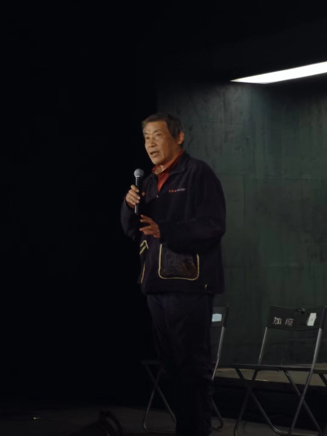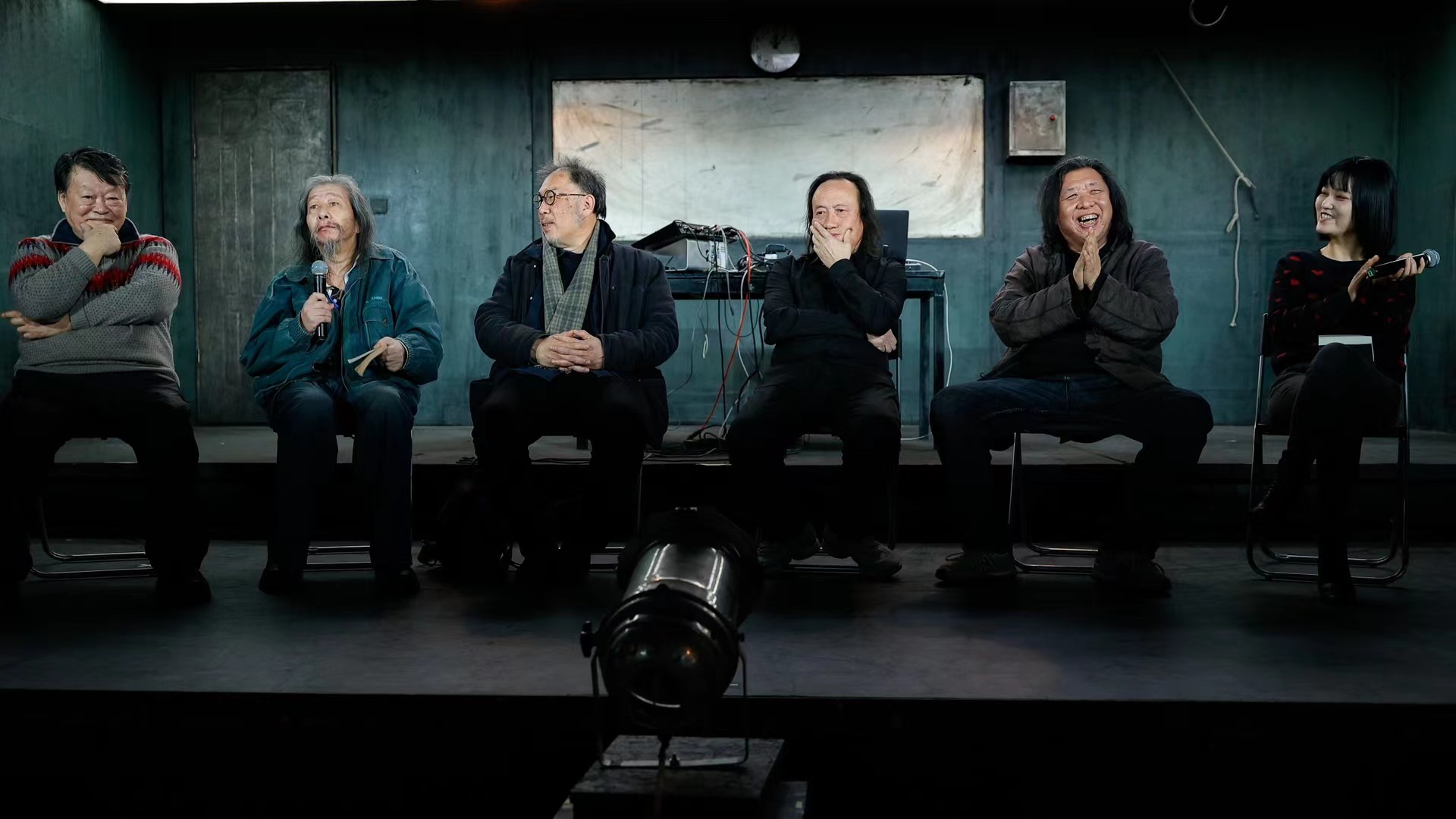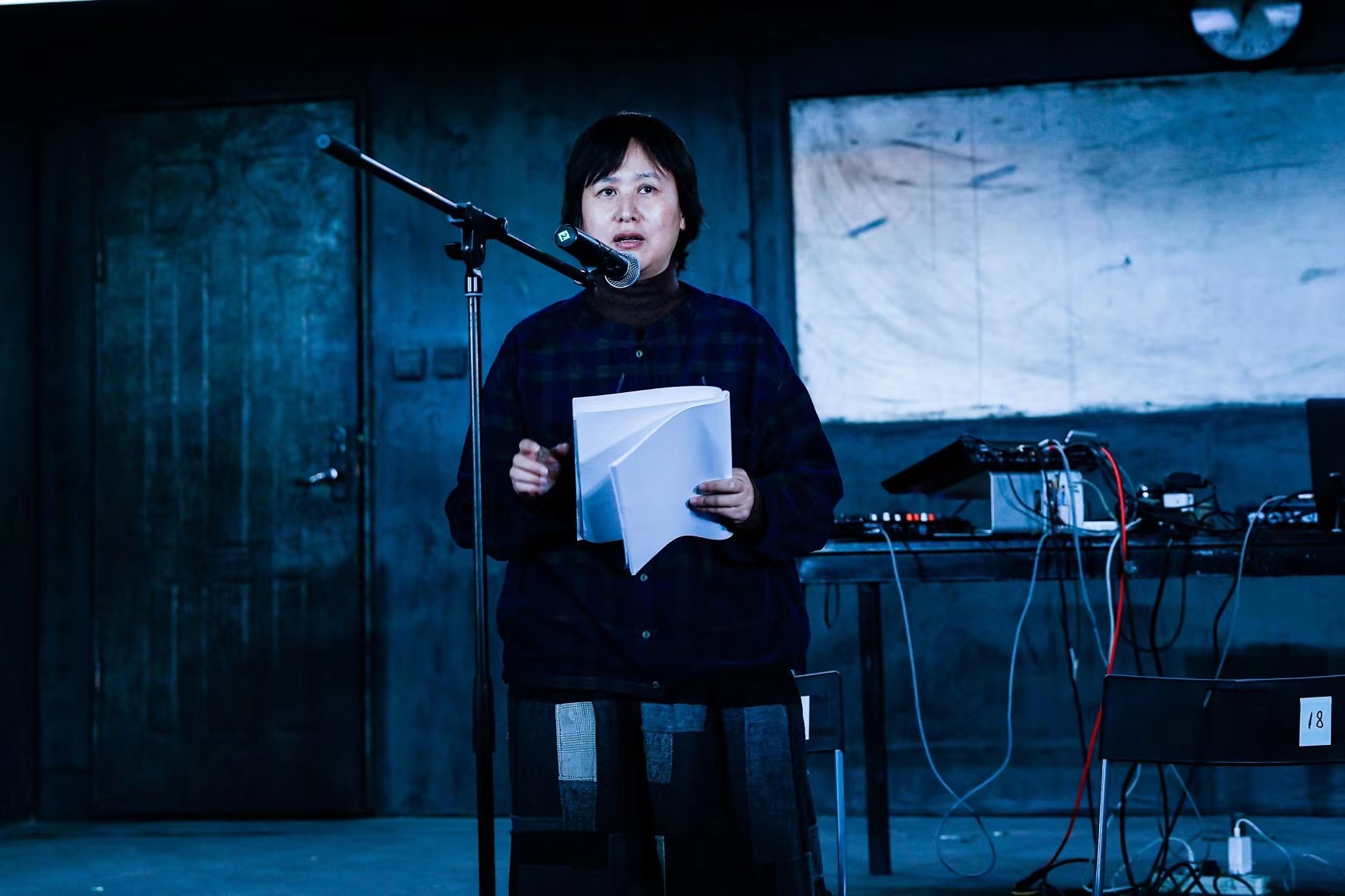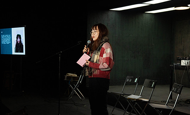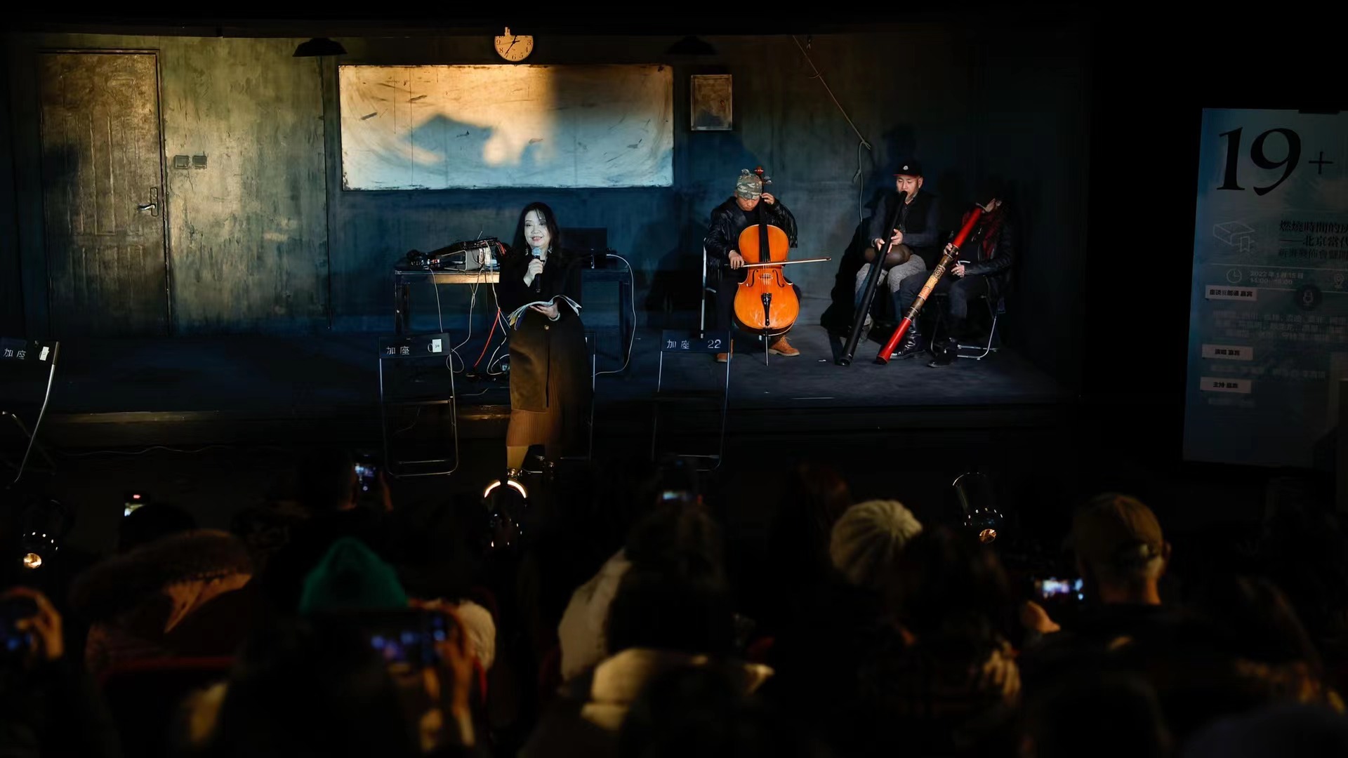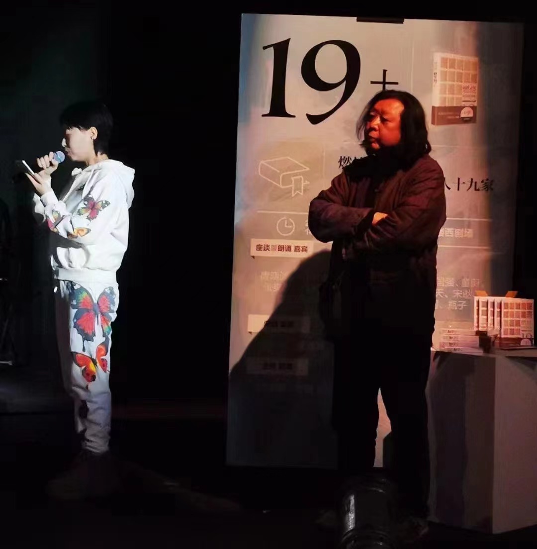 音樂人Gia Wang朗誦詩人宋逖作品時(shí),詩集編者老賀在臺側(cè)沉思