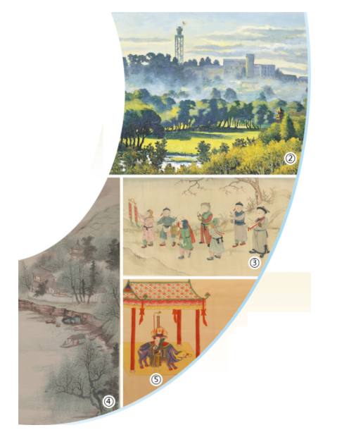 清代作品《八子迎春圖》(圖③)以明艷的色彩和細(xì)膩的手法,生動(dòng)地描繪了眾孩童喜氣迎春的場(chǎng)景。畫(huà)面以折枝梅花為背景突出了冬春之交的時(shí)令特征。八名孩童在鑼鼓聲中嬉戲行進(jìn)。為首一童子頭戴虎頭帽,手執(zhí)迎春對(duì)聯(lián)一副,上書(shū)“春王正月”“天下太平”八個(gè)大字,表現(xiàn)了迎春儀式中對(duì)于新一年吉祥安康的企盼。