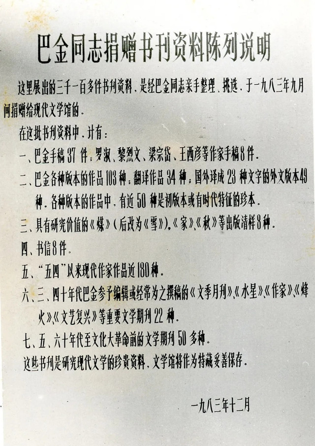 中國新聞社記者谷葦1983年9月23日發(fā)自上海題為《巴金在工作》的電訊中說,巴金大病后出院,一邊鍛煉一邊工作,其中談到給現(xiàn)代文學(xué)館捐贈書刊,他為我們留下了一幅巴金當(dāng)年工作的場景: