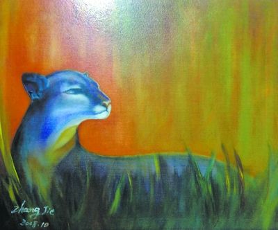 一幀畫于2008年的豹子,我愿意把它叫做雌性的雪豹。畫中雪豹正在回眸,被綢緞般亮麗而又鋒利的闊葉草簇?fù)?。那柔韌、結(jié)實(shí)的頸部與修長、矯健身軀所構(gòu)成的優(yōu)美曲線,襯著層次豐富的橙黃色眩目背景,使整個畫面充滿彈性的緊張感。逆光中的雪豹,當(dāng)它的脖頸被一團(tuán)側(cè)光照耀時(shí),作者有意凸顯的這個局部就煥發(fā)出揉雜著淡紫羅蘭色的高貴。接著你會被雪豹的眼神吸引:孤傲、警覺,又充溢著濕潤的憂郁,一種不打擾同類亦不打擾人類的自尊。我被這豹子的眼神所打動,強(qiáng)烈的主觀刻畫剎那間連接了動物和人心的溝通。對照那幅“寫意”的側(cè)臉女人,與這雪豹竟有一種靈魂與氣質(zhì)上莫名的神似。在張潔的畫作里,與生俱來一種人與動物、動物與風(fēng)景之間的平等和信任。在她心中的風(fēng)景里,也說不定動物比人更像人。我不能說這幅作品在藝術(shù)上達(dá)到何樣高度,但我可以說,張潔已顯示出她作為一個藝術(shù)家所必備的銳利眼光、表現(xiàn)能力和叛逆之心。她的畫面常大膽運(yùn)用橙黃、橙紅、桔黃等顏色,亦有大面積綠色入畫,更證實(shí)了她對色彩的自覺訓(xùn)練與胸有成竹的把控。黃和綠是油畫顏料里最容易被“畫臟”的顏色,張潔呈現(xiàn)給觀眾的是熱烈的明澄和清透的豐富。