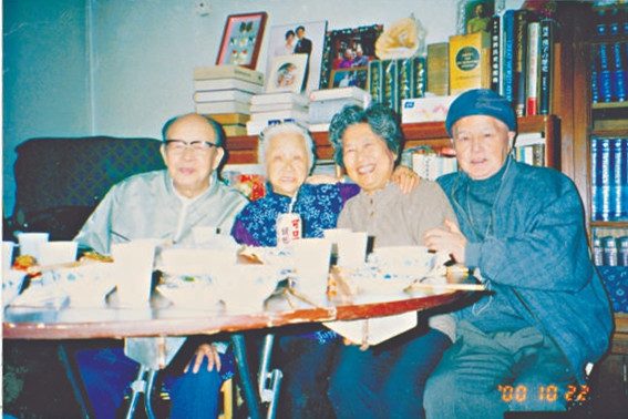 左起周有光、張?jiān)屎?、周孝華、張寰和在北京合影。