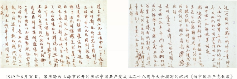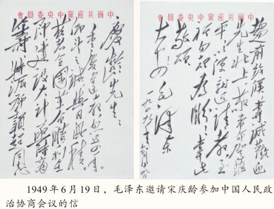 1949年5月27日,上海解放,宋慶齡感到由衷的歡喜,她愉悅地感嘆:“我們現(xiàn)在總算可以自由地呼吸了!”上海解放后,陳毅親自到宋慶齡的住所拜訪,并誠(chéng)懇地向她咨詢(xún)接管上海的建議。6月15日,新政協(xié)籌備會(huì)第一次全體會(huì)議在北平召開(kāi),籌建新政府的各項(xiàng)工作逐步啟動(dòng),25日,奉中共中央之命,鄧穎超攜帶著毛澤東、周恩來(lái)邀請(qǐng)宋慶齡的親筆信,由廖夢(mèng)醒陪同,專(zhuān)程抵達(dá)上海。毛澤東在信中寫(xiě)道:“慶齡先生:重慶違教,忽近四年。仰望之誠(chéng),與日俱積。茲者全國(guó)革命勝利在即,建設(shè)大計(jì),亟待商籌,特派鄧穎超同志趨前致候,專(zhuān)誠(chéng)歡迎先生北上。敬希命駕蒞平,以便就近請(qǐng)教,至祈勿卻為盼!專(zhuān)此敬頌大安!”這封信很短,但每句話(huà)都包含了濃重的敬意,此外,這封信沒(méi)有一處勾畫(huà)、一個(gè)墨點(diǎn),顯然經(jīng)過(guò)認(rèn)真謄寫(xiě),是一幅珍貴的“毛體書(shū)法”精品。鄧穎超一同送去周恩來(lái)的信中寫(xiě)道:“慶齡先生:滬濱告別,瞬近三年,每當(dāng)蔣賊肆虐之際,輒以先生安全為念。今幸解放迅速,先生從此永脫險(xiǎn)境,誠(chéng)人民之大喜,私心亦為之大慰?,F(xiàn)全國(guó)勝利在即,新中國(guó)建設(shè)有待于先生指教者正多,敢藉穎超專(zhuān)誠(chéng)迎迓之便,謹(jǐn)陳渴望先生北上之情。敬希早日命駕,實(shí)為至幸。耑上,敬頌大安?!敝芏鱽?lái)這封信卻有一處修改,將“略陳”改為了“謹(jǐn)陳”,一字之變,更添敬意。宋慶齡讀完來(lái)信深受感動(dòng),毅然決定同意北上。6月30日,在上海市舉行的慶祝中國(guó)共產(chǎn)黨成立二十八周年大會(huì)上,宋慶齡發(fā)表了熱情洋溢的祝詞《向中國(guó)共產(chǎn)黨致敬》:“歡迎我們的領(lǐng)導(dǎo)者——這誕生在上海、生長(zhǎng)在江西的叢山里、在二萬(wàn)五千里長(zhǎng)征的艱難困苦中百煉成鋼、在農(nóng)村的泥土里成熟的領(lǐng)導(dǎo)者。向中國(guó)共產(chǎn)黨致敬!”