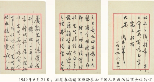 千篇著述誠(chéng)難得,一字知音不易求。在中國(guó)共產(chǎn)黨帶領(lǐng)人民即將取得新民主主義革命偉大勝利的前夕,以毛澤東同志為主要代表的中國(guó)共產(chǎn)黨人,虛心向各民主黨派、人民團(tuán)體和民主人士通電,邀請(qǐng)他們參與到籌建新中國(guó)的偉大事業(yè)中來(lái)。中國(guó)共產(chǎn)黨歷史展覽館的一處展柜內(nèi)展出了兩封珍貴的書(shū)信,兩封信的寫(xiě)作者分別是毛澤東與周恩來(lái),而收件人均為“慶齡先生”。這兩件珍貴的文物既反映了中共中央在籌建新中國(guó)的過(guò)程中對(duì)宋慶齡赴北京共商建國(guó)大計(jì)的殷切盼望,同時(shí)又表達(dá)了對(duì)宋慶齡的尊重與敬意。