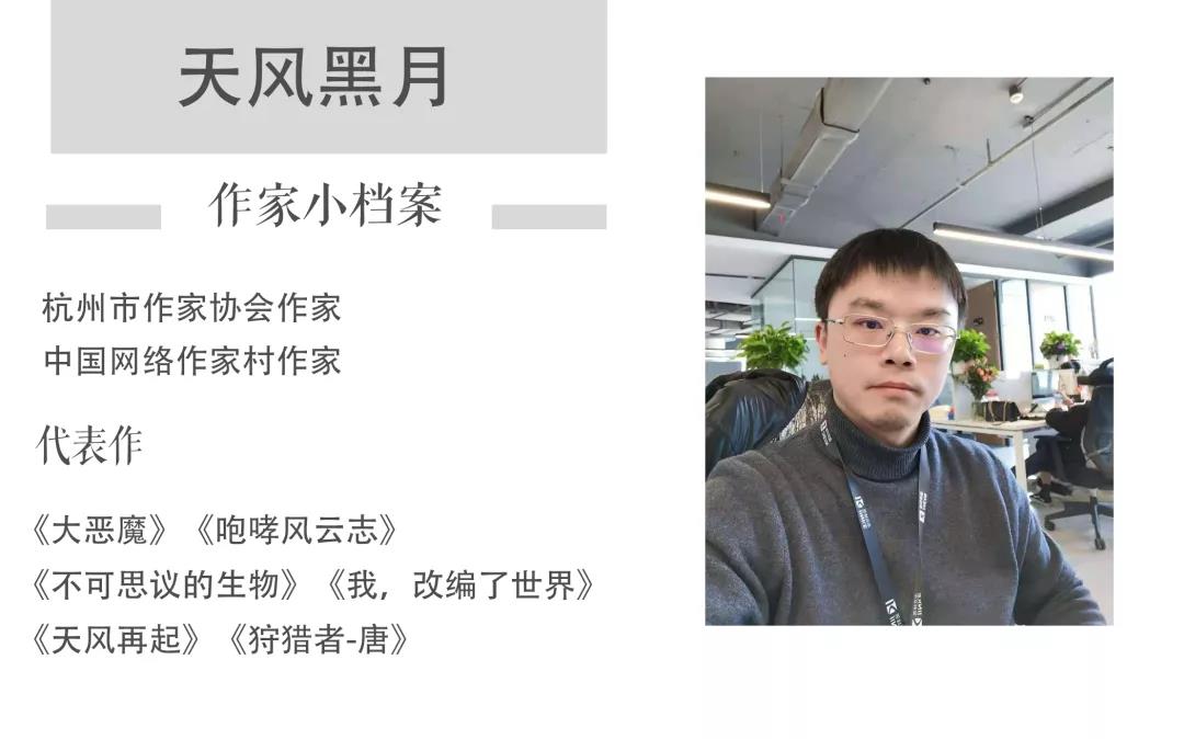 天風(fēng)黑月,杭州市作家協(xié)會(huì)作家,中國(guó)網(wǎng)絡(luò)作家村村民,憑借其獨(dú)特的“腦洞”吸引了無數(shù)忠實(shí)讀者,代表作有《大惡魔》《咆哮風(fēng)云志》《不可思議的生物》《我,改編了世界》《天風(fēng)再起》《狩獵者-唐》等。