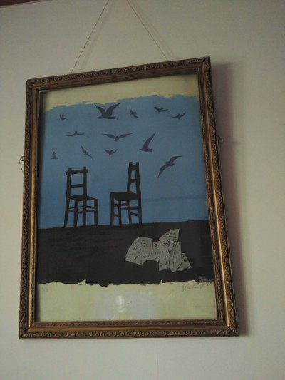 這些天,我常常想起先生家中客廳的墻上掛著的一幅泛著藍(lán)色暗光的畫(huà)作:兩把椅子在空曠寂寥的地平線上相對(duì)而坐,幾張報(bào)紙?jiān)诘叵律⒙?,飛鴿在天空中盤(pán)旋,仿佛在召喚離別的人們。空了的椅子,并沒(méi)有人坐在那里,然而,曾經(jīng)的日子不會(huì)遠(yuǎn)去,它們仿佛在訴說(shuō)著不久之前那兩把椅子的主人正相對(duì)而坐,敘談著往日的生活……
