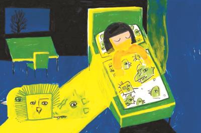 比如,前環(huán)襯之中用簡單而又童真的線條勾畫的小鳥、小豬、恐龍和獅子,讓暫時還未進入故事的讀者,有了打開濃郁藍色封面后的輕松愉悅之感。讀完故事,翻到后環(huán)襯,更能體會這種輕盈卻承載萬千之重的表達。因為正是通過正文故事中這四種動物不同的反應,讓女孩對男孩的情感層層遞進。這一點作者也做了詳細的闡釋:首先是在男孩窗前枝頭唱歌的小鳥,象征著女孩的感情被喚醒——如鳥兒喚醒清晨一般。之后是小豬,憨態(tài)可掬的樣子展現出一種單純和可愛——此刻女孩也多了一絲與男孩靠近的勇氣。接著是小恐龍面具——女孩在夜晚回家的路上保護著男孩,感情更進了一步。直到小獅子面具的出現,女孩的愛到達了最高點。她不在乎其他人的眼光,因為她的眼里只有男孩。獅子面具有著像太陽光一樣的射線,象征著女孩對男孩的愛像太陽一樣熾烈。