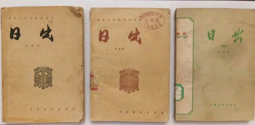 左:“戲劇”版《日出》,1957年9月北京第1版第1次印刷;中:“戲劇”版《日出》,1957年9月北京第1版,1959年4月北京第3次印刷;右:“戲劇”版《日出》,1957年9月北京第1版,1960年4月北京第4次印刷。