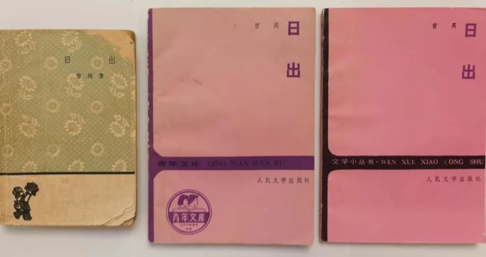 左:“小叢書”版《日出》1959年12月北京第1版第1次印刷;中:“青年文庫(kù)”叢書《日出》1959年12月北京第1版,1990年8月北京第1次印刷;右:“文學(xué)小叢書”《日出》1959年12月北京第1版,1992年12月北京第2次印刷。