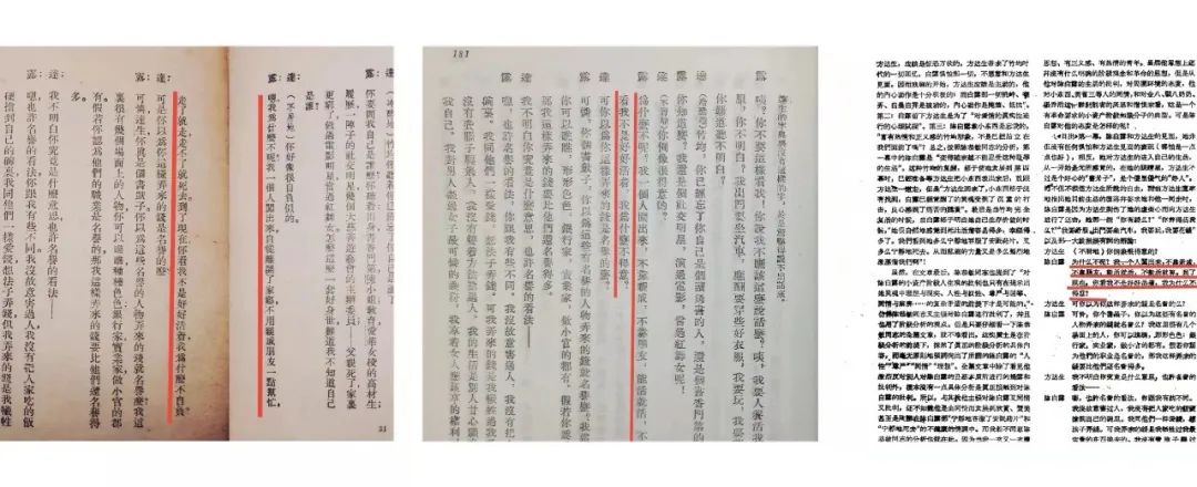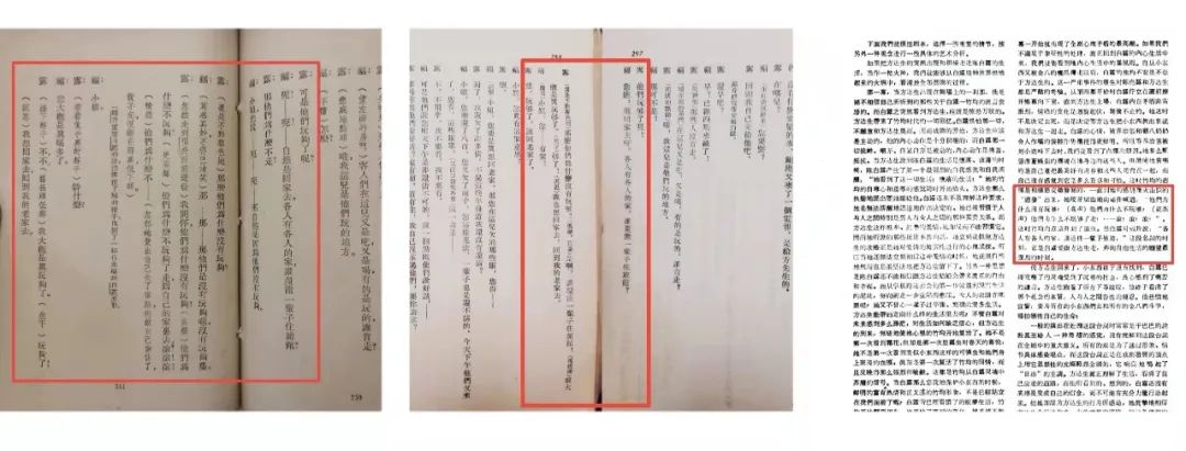 左:上海文化生活出版社《日出》,第250、251頁(yè);中:人民文學(xué)出版社《曹禺劇本選》,第297、298頁(yè);右:陳恭敏《什么是陳白露悲劇的實(shí)質(zhì)》,《戲劇報(bào)》1957年第5期。比較可知,陳恭敏的引用出自上海文化生活出版社《日出》。