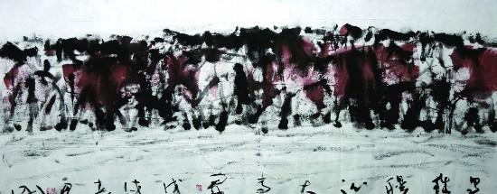 生命的風(fēng)景,我是從多達(dá)數(shù)十幅不同主題的草原風(fēng)光中看到的。如《套馬桿》(2010)、《草原的節(jié)日》(2012)、《那達(dá)慕開幕式》(2013)、《摔跤手出場》(2013)、《烏珠穆沁大馬群》(2018)等?!恫菰墓?jié)日》寥寥數(shù)筆,一組蒙古漢子歡快地搭肩踢腿舞蹈得以呈現(xiàn),看著他們,就像聽到了踏著節(jié)拍的強(qiáng)烈節(jié)奏?!端邮殖鰣觥肪€條多了不少,摔跤手甩開的長袍、飄起的衣襟、雄健的跨步,傳遞出他旺盛的生命力。137*309厘米的大幅作品《烏珠穆沁大馬群》中,馬匹繪滿了畫面,既看不出馬群是向人前踏行,也看不出馬群是向天邊飛馳,但是,就是令人感到馬群的巨大生命力!或許畫家正是通過模糊的、聚集的、色彩不一的馬匹,傳遞了草原上健康的旺盛的熱烈的生命。
