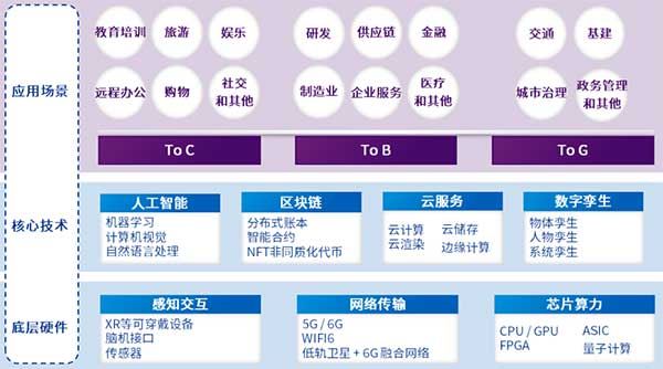 目前來看,元宇宙生態(tài)包含底層硬件、核心技術(shù)和應用場景等幾大組成部分。其中底層由感知交互設備、網(wǎng)絡傳輸、芯片算力等基礎硬件構(gòu)成。在此基礎上,人工智能、區(qū)塊鏈、云服務、數(shù)字孿生等核心技術(shù)共同構(gòu)建了一個豐富的數(shù)字世界。畢馬威中國通信、媒體及科技行業(yè)審計主管合伙人盧鹍鵬表示,元宇宙在消費者端(to C)、企業(yè)端(to B)、政府端(to G)都有著豐富應用場景,將對娛樂、購物、遠程辦公、金融、制造業(yè)、城市治理、研發(fā)等領域帶來深刻影響,元宇宙所帶動的經(jīng)濟和商業(yè)模式變革也可能催生新的業(yè)態(tài)。但也要看到,元宇宙產(chǎn)業(yè)的整體技術(shù)發(fā)展仍處于萌芽階段,距離接棒移動互聯(lián)網(wǎng)成為數(shù)字經(jīng)濟下一站還有較長的道路要走,需要多方面共同努力。