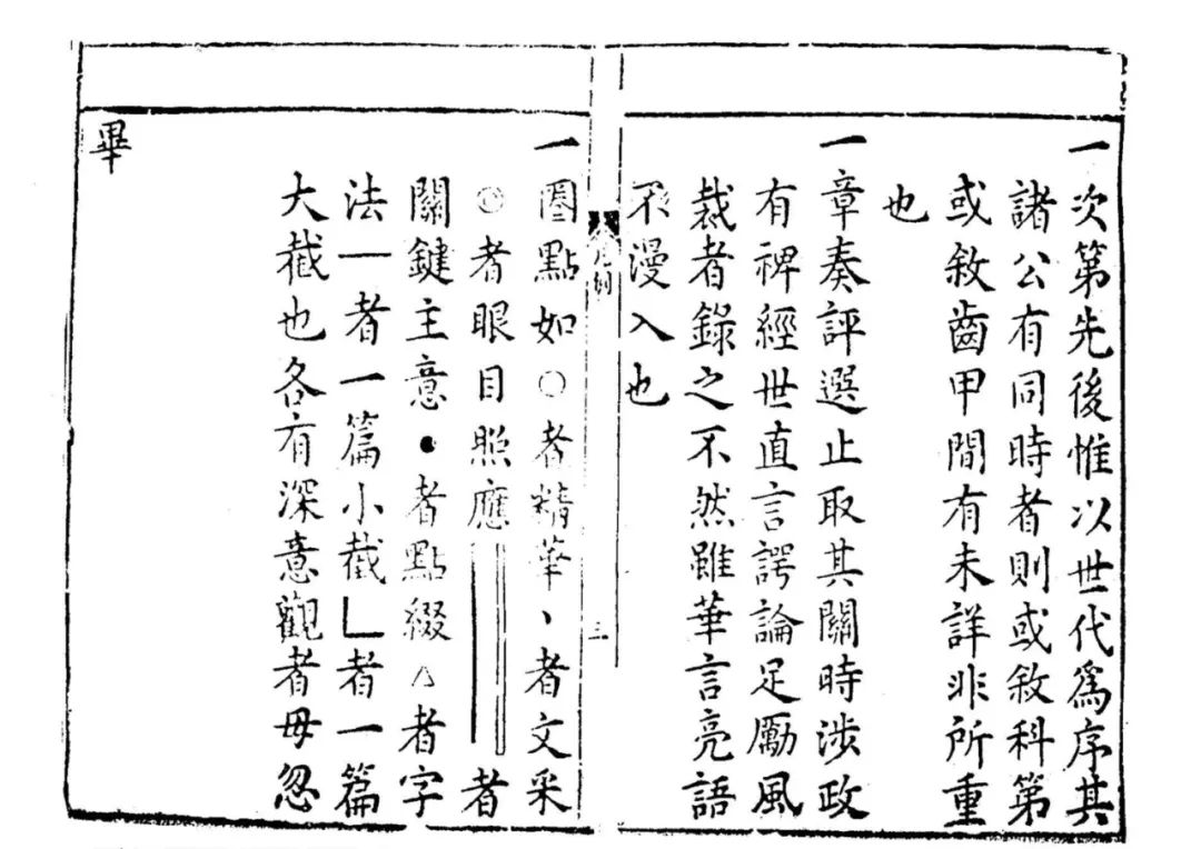 一是以圈點符號來標示選文的評價等級。例如晚明的舉業(yè)用書《新鐫選釋歷科程墨二三場藝府群玉》,由衢州書坊翁日新刻印。此書署焦竑、王衡同選,唐汝瀾注,邵名世、王時學同校,翁日新繡梓。焦竑、王衡之名當系偽托,實際的編選、注釋工作應(yīng)由唐汝瀾承擔。唐汝瀾對所選科考二三場中論、表、判、策程墨的等級評選,皆以圈點作為標示。對此,書前《新鐫選釋歷科程墨二三場群玉圈點凡例》有清晰的說明: